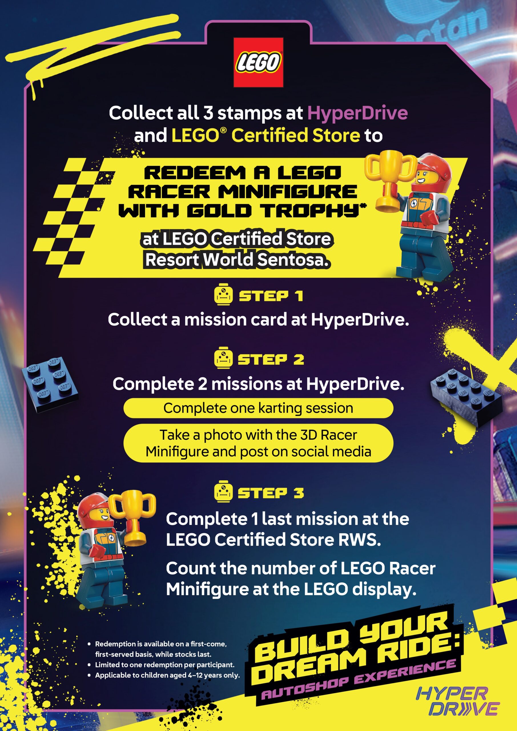 Upon completing all missions and collecting the required stamps, participants can present their completed mission card to the LEGO Certified Store Resort World Sentosa staff to redeem an exclusive LEGO Racer Minifigure with Gold Trophy.